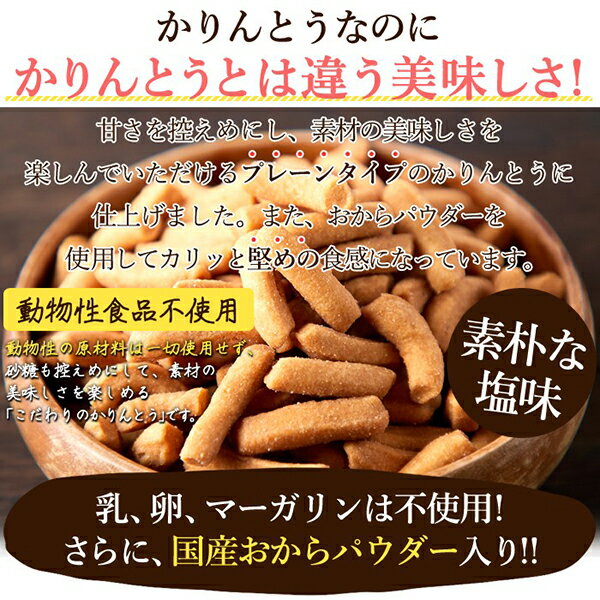 スペック* 品名:プレーンかりんとう* 名称:油菓子* 原材料名:小麦粉(小麦(国内産))、てん菜糖、植物油脂、おからパウダー(大豆を含む)、食塩/膨張剤(重曹)* 内容量:1kg(250g×4袋)* 賞味期限:製造日より常温120日(約40日〜120日弱賞味期限が残ったものでのお届けとなります)* 保存方法:直射日光、高温多湿をお避け下さい* 販売者:株式会社天然生活 東京都品川区大崎3丁目6-4 トキワビル7階※ 本品製造工場では、乳成分、卵、そば、落花生を含む製品を製造しております。